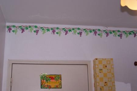 Le mur de la chambre en marron ne me plaisait pas avec la déco, j'ai donc eu une idée en contemplant mon mur, ce qu'il manquait c'était de la luminosité, j'ai donc eu envie de mettre du blanc pour rappeler les tons de la chambre, et ni une ni deux je l'ai fait, j'ai mis une parure de drap adaptée à la chambre, je vais mettre des photos avant après rassurez vous enfin de la nouvelle déco pas de l'ancienne hein ? Donc avec papa, on a cherché un panneau en bois blanc, merci papa de conserver tout ce que tu peux trouver cela sert toujours, j'ai fait une mini frise au wico rappelant le ton des bambous adhésifs et je vais fixer dessus des photos avec de la pate à fixe, déco changeante au gré des humeurs pas mal non ??? Pour cacher le derrière de la tête de lit j'ai pris deux vieilles serviettes gagnées à Yves Rocher que j'ai découpées en deux et fixées par des punaises vertes le long de la tête de lit. Déco pas cher en attendant de trouver mieux, de toute manière si un jour on déménage et on le fera forcément que cela soit pour une location ou une maison bien à nous, on ne remettra pas la tête de lit, et on en changera, j'aimerais un lit plus grand donc maintenant j'arrête d'acheter des parures de draps lit 2 personnes en 140, mais j'attaque en 160 ou 200 on ne sait pas encore et dans les tons verts, marrons et blancs, ces teintes là me plaisent.