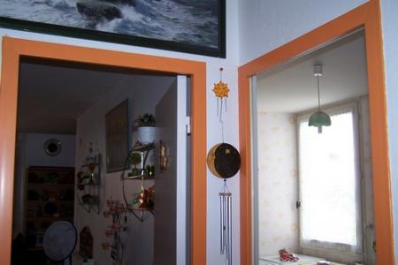 salle à manger en haut, couloir en bas, étagère repeinte en vert et contour de porte orange.